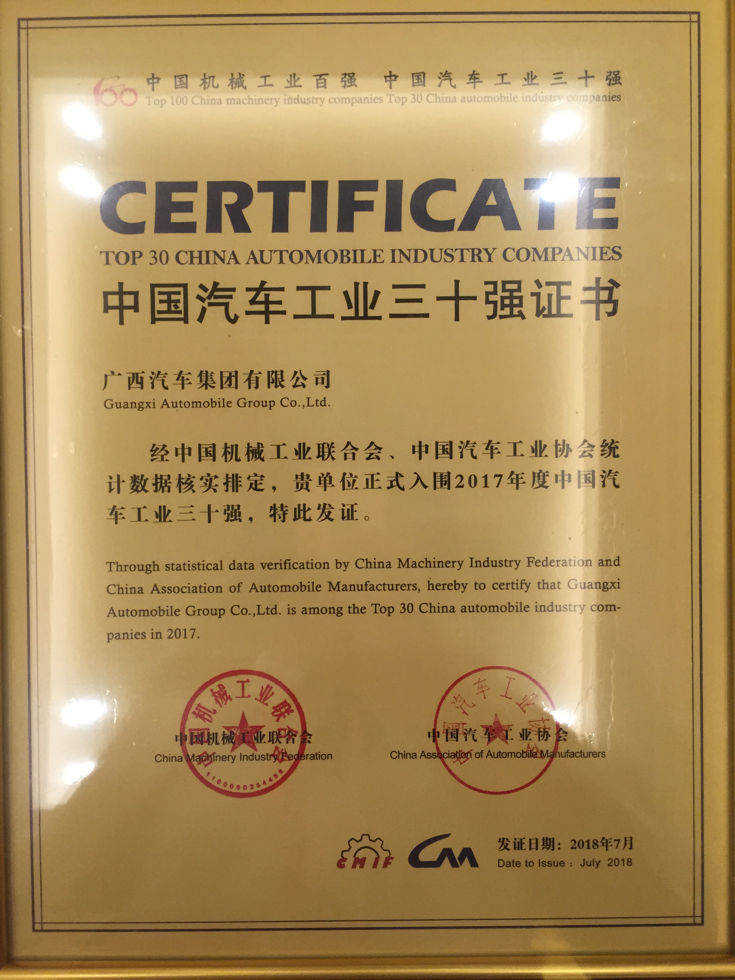 2018年7月13日,由中國(guó)機(jī)械工業(yè)聯(lián)合會(huì)、中國(guó)汽車工業(yè)協(xié)會(huì)聯(lián)合組織開展的“2017年中國(guó)機(jī)械工業(yè)百?gòu)?qiáng)企業(yè)、汽車工業(yè)30強(qiáng)企業(yè)”榜單揭曉并正式向社會(huì)發(fā)布,廣西汽車集團(tuán)公司以2017年度營(yíng)業(yè)收入220億元榮登“2017中國(guó)汽車工業(yè)30強(qiáng)企業(yè)”榜單,排名第21位,集團(tuán)已連續(xù)10年躋身“中國(guó)汽車工業(yè)30強(qiáng)企業(yè)”行列。