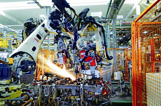 ?????????? ???? 7月9日,廣西汽車集團(tuán)自動(dòng)化焊接生產(chǎn)線的工業(yè)機(jī)器人在焊接汽車構(gòu)件。該集團(tuán)近三年增加機(jī)器人300多臺(tái),建成18條自動(dòng)化生產(chǎn)線,凝成多種重要汽車部件的生產(chǎn)能力。今年,1-6月份,該集團(tuán)汽車制造業(yè)務(wù)收入實(shí)現(xiàn)78.02億元,同比增長(zhǎng)15%。使用機(jī)器人已成為柳州80%以上工業(yè)企業(yè)的意愿。